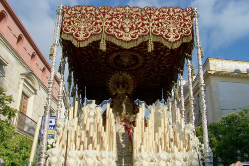 La Ermita de San Telmo se fundó en el siglo XVI, aunque los jerezanos creemos que siempre "aestao ahí". En 1580 se fundó la Hermandad de Ntra. Sra. del Valle. A finales del XVI llegó a Jerez la imagen del Cristo de la Expiración, y muy pronto pasó a ser titular de la Hermandad del Valle. De tamaño natural y de papelón (cartón encolado), en el año 1950 no hubo más remedio que hacer una copia en madera. Es tal la influencia que el Cristo tiene en Jerez que, a petición de sus devotos, el 6 de noviembre de 1994 le fue impuesta la Medalla de Oro de la ciudad. Va sobre una cruz de plata de ley de 1744, obra del asidonense Francisco Márquez y donada por Alberto Manuel Caballero. El paso es de cedro, de Lutgardo Pinto Ruiz, se estrenó en el año 1937. El San Juan es una imagen de mediados del siglo XVII; sufrió una drástica restauración en el XVIII y algunas más a lo largo del XIX y el XX. El paso, de cedro y apliques de plata es de Guzmán Bejarano. Lo talló entre 1966-74. La Dolorosa, obra anónima, también ha soportado varias restauraciones y retoques. Consta su existencia desde principios del XVII. Los dos pasos de misterio van cargados por fuera; el de palio, desde el año 1955, va cargado por dentro. Estudios Orfebrería Triana, Taller Viuda de Villarreal y Manuel Rodríguez son los autores de las distintas piezas de orfebrería. Los bordados del palio y del manto son de Carrasquilla; el primero es del año 1962 y el manto de 1968. Todo es de terciopelo rojo. Carrasquilla también bordó, en el año 1955, la "Vela" del Cristo. La corona procesional tiene la ráfaga labrada por las dos caras, es de Estudios Orfebrería Triana y se estrenó en el año 1986.