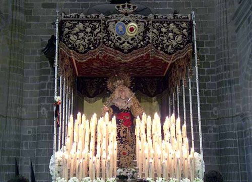 Los orígenes de esta hermandad están en la gremial de zapateros, curtidores y zurradores fundada en 1488. En el año 1850 se aprueban los estatutos de la nueva Hermandad del Dolor. Después de una etapa de postración, en 1921 la cofradía vuelve a tomar un auge que no ha cesado. De la Semana Santa del Barroco conserva dos imágenes muy singulares: Ntra. Sra. del Mayor Dolor y San Bartolomé. La Virgen del Mayor Dolor es talla anónima, del siglo XVII, que tradicionalmente se ha atribuido al círculo de Martínez Montañés. Contemplando el rostro de cerca se observa una interpretación de la anatomía, que tiene "cosas" muy valientes, aunque muy poco que "ver" con lo Montañesino. Imágenes titulares, para el paso de misterio, ha tenido varias. Desde finales del siglo XIX hasta principios del XX procesionó un Ecce Homo, todo de talla, que llegó de Valencia junto a las figuras de Pilatos y el sayón; éstas dos figuras todavía salen. La imagen actual es una talla de finales del XVII o principios del XVIII, que Francisco Pinto Berraquero restauró en el año 1992. El paso es todo de orfebrería. La canastilla es la parte más antigua (su decoración es muy del gusto neoclásico) y se debe a la firma Hijos de Leoncio Meneses, de Madrid. Los respiraderos son de Seco Imbert, 1927-28. El taller de Villarreal reformó el paso en el 64 y lo prolongó en el 76. Del paso de palio, pese a lo notable de muchas de sus piezas (los faldones, los candelabros de cola, los varales que son de plata de ley ...) debemos destacar el manto y el palio. Las dos piezas las diseñó José Tova Villalba y las bordó Juan Manuel Rodríguez Ojeda para la Hermandad del Refugio de San Bernardo, de Sevilla, en el año 1903. La Hermandad del Mayor Dolor los adquirió en el año 1927. Y verdaderas piezas de museo por los materiales y la ejecución son el puñal que traspasa el corazón de la Virgen y la corona con que procesiona.