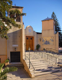 Santuario de María Auxiliadora. Los Hijos de Don Bosco llegaron a Jerez en el año 1897. El primer colegio que fundaron estuvo en la calle Pedro Alonso: fue un centro femenino, dirigido por las Hijas de María Auxiliadora. En 1946 comenzó a funcionar el Centro Domingo Savio - hoy lleva el título de su promotor, Padre Torres Silva -. En la actualidad los salesianos tienen en Jerez cinco casas. El Santuario de María Auxiliadora está enclavado en el Pago de la Serrana, dentro del gran complejo que es el Centro Salesiano Lora Tamayo. La primera piedra se puso al comienzo de los años 70 del pasado siglo, y el 25 de mayo de 2000 lo bendecía Don Rafael Bellido Caro, Obispo de Asidonia-Jerez. El autor del proyecto, Miguel Ordóñez Ruiz. La imagen de María Auxiliadora fue tallada por el antiguo alumno salesiano José Pérez Conde.