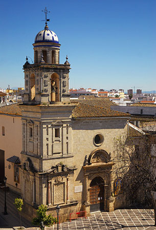 Iglesia de la Victoria. Los religiosos mínimos llegaron a Jerez hacia 1517. Del enorme convento sólo queda la iglesia (a mediados del pasado siglo fue derribada la cabecera y se acortó casi a la mitad su longitud). Se conservan intactos la torre y el claustro. Éste forma parte actualmente de la Escuela de Artes. La iglesia tiene una bella portada renacentista, atribuida a Hernán Ruiz, donde consta la fecha de su construcción: 1546. El retablo es de mediados del siglo XVIII y de estilo rocalla. La torre construida entre 1636 y 1642 por Antón Martín Calafate consta de tres cuerpos coronados por media naranja recubierta de azulejos. Este arquitecto fue probablemente el que reformó el interior de la iglesia en la primera mitad del siglo XVII. Entre las imágenes del pasado está la del Señor de los Trabajos, del primer tercio del siglo XVII, que cuenta con la devoción de muchísimos jerezanos.