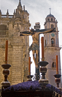 El Cristo de la Viga procesiona el Lunes Santo desde el año 1926, aunque no tendrá cofradía propia hasta el año 46. A finales del siglo XVII se organizó una cofradía para rendir cultor a ésta imagen, y su salida se dieron siempre en ocasiones muy especiales (sequía, epidemias, ...). El paso de misterio se labró en el año 1928 para la Hermandad del Santo Crucifijo; fueron el carpintero José Asencio Vivero y los hermanos Cintado quienes hicieron las tallas. Se adquirió en 1947 para esta hermandad. Del año 60 son los cuatro portahachones.