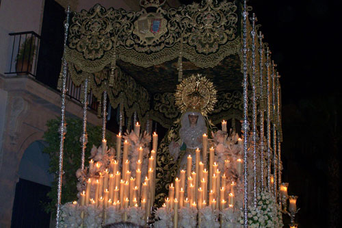 En el año 1928 se intenta fundar una cofradía en la Capilla de la Yedra. Al poco tiempo adquirieron una Dolorosa, que había sido la titular de la Hermandad de los Dolores. En el año 1930 hace la primera Estación de Penitencia. En el año 37 una comisión reorganizadora fija las líneas maestras de la actual hermandad. En diciembre del 39 la hermandad compró por 1.250 ptas. las ocho figuras que componían el misterio de la Hermandad de la Macarena. Ahora sólo procesionan seis, que para algunos entendidos son de 1654. Estas figuras, al parecer, fueron retocadas en 1898. En marzo de 1948 se bendice la imagen del Señor, obra del valenciano Carmelo Vicente Suria. El paso se comenzó a tallar en el año 1986 y quedó totalmente terminado en el 92. El diseño es de Antonio Martín Fernández; las imágenes del canasto, de Manuel Carmona y el dorado, de Artesanía Arosa. Ya se ha dicho que la Dolorosa fue titular de una hermandad fundada a mediados del siglo XVIII y de estos años es la imagen. Ahora, y después de restaurada por Francisco Bazán y Francisco García Brenes (2006) se asegura que su autor fue Diego Roldán Serrralllonga. En el año 1946 Esperanza Elena Caro comenzó a bordar el palio. El palio y el manto son de terciopelo verde; los faldones, de terciopelo rojo del año 52. El diseño del manto es de Ignacio Gómez Millán (Ignacio era el único miembro de esta familia que "oficialmente" no tenía nada que ver con el arte, era químico. Ahora se habla de abrir un proceso para su beatificación). Es de suma importancia la imagen venera de éste paso. En plata de ley se ha copiado la imagen que se venera en la Capilla del Sagrario, de la Parroquia de Madre de Dios. La imagen está policromada y el estofado se ha imitado perfectamente con un pulcro cincelado. Es obra del Taller Lorenzo, Jiménez y Rueda.