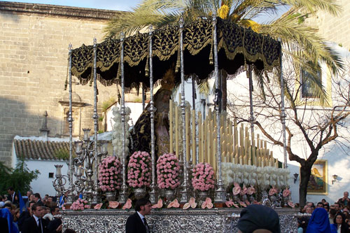 En el año 63 hizo su primera Estación de Penitencia sólo con el paso de palio. Diez años después salía el paso de misterio. La primera imagen del Cristo de la Exaltación procesionó hasta el año 1990. En marzo del 91 se bendijo la talla actual que se debe a las gubias de Luis González Rey. En el año 1998 es sustituido el primitivo paso de misterio. El actual se talló en Cádiz, y las imágenes y los altorrelieves que decoran la canastilla fueron modelados por Nuria Guerra Castellano. El misterio primitivo lo componían el Titular y tres sayones. En 1984 se le encargaron a Francisco Pinto unos sayones ... Pinto cambió la composición del misterio y talló cuatro figuras. A este nuevo grupo se le añadió en el 93 una Magdalena y en el 98 un soldado romano: ambos son del autor del Cristo, Luis González Rey. La Dolorosa es una imagen de candelero, obra del jerezano Manuel Prieto Fernández. Fue bendecida en julio de 1959; el párroco de las Viñas la coronó solemnemente el 8 de diciembre de 1968. Y en diciembre del año 2004 CORONADA CANÓNICAMENTE. Según el decreto del Obispo de la Diócesis con esta coronación se conmemorarán dos fechas muy importantes: el 150 aniversario de la proclamación del Dogma de la Inmaculada Concepción (recordamos que la advocación de la Dolorosa es María Santísima de la Concepción) y los 25 años de la creación de la Diócesis de Asidonia-Jerez. El paso de palio, ya se ha dicho salió antes que el de misterio. Con el "trabajo" de sus cofrades y el apoyo de su barriada y las adyacentes, la Dolorosa muy pronto tuvo bordado el manto. La saya, de terciopelo azul igual que el manto, se realizó con los bordados de un traje de luces de José María Manzanares. En el año 1960 son aprobadas las reglas de esta hermandad. En el 61 y en el 62 salió una representación de la cofradía; el primer año con la Hermandad de la Soledad y el segundo con la de Loreto.