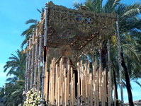 Cuando salió el misterio del Traslado al Sepulcro, en el año 66, la Virgen del Patrocinio comenzó a procesionar en una paso de palio. Los respiraderos los repujó Manuel Rodríguez para la Hermandad de la Soledad. Los candelabros de cola son de Jesús Rodríguez. El resto de las piezas son del Taller Viuda de Villarreal. Todo es de plata cofradiera. El techo del palio es de malla y bordado por Fernández y Enríquez. Las caídas son de José Antonio Cachero. El manto de terciopelo, color burdeos, lo comenzó a bordar Fernández y Enríquez en los años ochenta. Está sin terminar. Casi todas las insignias tienen un diseño muy cuidado, y sobre todas destaca la originalidad de la Cruz de Guía; es del Taller de Villarreal del año 1961.