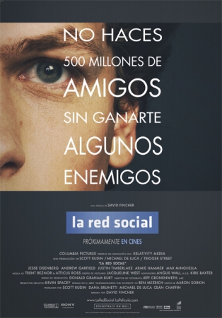 Título original: The Social Network. Dirección: David Fincher. País: USA. Año: 2010. Duración: 122 min. Género: Drama. Interpretación: Jesse Eisenberg (Mark Zuckerberg), Justin Timberlake (Sean Parker), Rooney Mara (Erica), Rashida Jones (Marylin Delpy), Andrew Garfield (Eduardo Saverin), Armie Hammer (Cameron Winklevoss/Tyler Winklevoss), Max Minghella (Divya Narendra). Guión: Aaron Sorkin; basado en el libro “Multimillonarios por accidente” de Ben Mezrich. Producción: Dana Brunetti, Ceán Chaffin, Michael De Luca y Scott Rudin. Música: Trent Reznor y Atticus Ross. Fotografía: Jeff Cronenweth. Montaje: Kirk Baxter y Angus Wall. Diseño de producción: Donald Graham Burt. Vestuario: Jacqueline West. Distribuidora: Sony Pictures Releasing de España. Estreno en USA: 1 Octubre 2010. Estreno en España: 15 Octubre 2010.