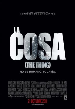 Película: La cosa (The thing). Título original: The thing. Dirección: Matthijs Van Heijningen. País: USA. Año: 2011. Duración: 103 min. Género: Terror. Interpretación: Mary Elizabeth Winstead (Dra. Kate Lloyd), Joel Edgerton (Braxton Carter), Eric Christian Olsen (Adam Goldman), Ulrich Thomsen (Dr. Sander), Adewale Akinnuoye-Agbaje (Jameson), Trond Espen Seim (Edvard Wolner). Guion: Eric Heisserer; basado en el relato “Who goes there?”, de John W. Campbell Jr. Producción: Marc Abraham y Eric Newman. Música: Marco Beltrami. Fotografía: Michel Abramowicz. Montaje: Julian Clarke y Peter Boyle. Diseño de producción: Sean Haworth. Vestuario: Luis Sequeira. Distribuidora: Universal Pictures International Spain. Estreno en USA: 14 Octubre 2011. Estreno en España: 21 Octubre 2011.