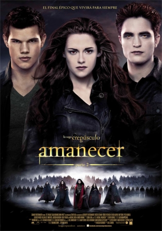 Dirección: Bill Condon, Guion: Melissa Rosenberg. Novela: Stephenie Meyer, Reparto: Robert Pattinson, Kristen Stewart, Peter Facinelli, Dakota Fanning, Ashley Greene, Billy Burke, Taylor Lautner, Nikki Reed, Kellan Lutz, Jackson Rathbone, Michael Sheen, Elizabeth Reaser, Música: Carter Burwell, Fotografía: Guillermo Navarro, Compañías: Summit Entertainment, Temple Hill Entertainment, Sunswept EntertainmentGénero: FantásticoRomanceThriller | VampirosHombres loboSecuelaYoung Adult.