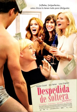 Película: Despedida de soltera (Bachelorette). Título original: Bachelorette. Dirección y guion: Leslye Headland. País: USA. Año: 2012. Duración: 87 min. Género: Comedia. Interpretación: Kirsten Dunst (Regan), Isla Fisher (Katie), Lizzy Caplan (Gena), Rebel Wilson (Becky), Adam Scott (Clyde), James Marsden (Trevor), Kyle Bornheimer (Joe), Hayes MacArthur (Dale), Ann Dowd (Victoria). Producción: Brice Dal Farra, Claude Dal Farra, Jessica Elbaum, Will Ferrell, Adam McKay y Lauren Munsch. Música: Andrew Feltenstein y John Nau. Fotografía: Doug Emmett. Montaje: Jeffrey Wolf. Diseño de producción: Richard Hoover. Vestuario: Anna Bingemann. Distribuidora: Vértigo Films. Estreno en USA: 7 Septiembre 2012. Estreno en España: 4 Enero 2013.