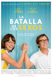 Título original: Battle of the Sexes, Año: 2017, Duración: 121 min, País: Estados Unidos, Director: Jonathan Dayton, Valerie Faris, Guion: Simon Beaufoy, Música: Nicholas Britell, Fotografía: Linus Sandgren, Reparto: Emma Stone, Steve Carell, Andrea Riseborough, Elisabeth Shue, Austin Stowell, Sarah Silverman, Alan Cumming, Eric Christian Olsen, Jessica McNamee, Mickey Sumner, James Mackay, Agnes Olech, Chet Grissom, Chip Chinery, John C. McGinley, Productora: Cloud Eight Films / Decibel Films / Fox Searchlight Pictures, Género: Comedia | Tenis. Basado en hechos reales. Años 70. Homosexualidad