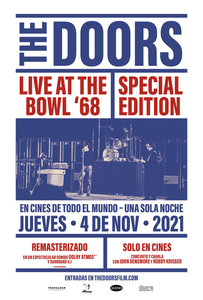 CONTENIDO +QUE CINE. El 5 de julio de 1968, The Doors electrizó el famoso escenario del Hollywood Bowl con un legendario espectáculo que se considera el mejor concierto de la banda jamás grabado. Tras su tercer álbum, Waiting For The Sun, y el single "Hello, I Love You”, que alcanzó el número 1 en Estados Unidos, el cuarteto había pasado dos años perfeccionando sus actuaciones en vivo y estaba en su mejor forma. Ahora, el 4 de noviembre de 2021, para celebrar el 50 aniversario del último álbum de estudio de The Doors, L.A. WOMAN (1971), The Doors: Live At The Bowl ’68 Edición especial transformará los cines en salas de concierto para darles a los incondicionales de la banda la experiencia más cercana a estar en persona junto a Jim Morrison, John Densmore, Ray Manzarek y Robby Krieger, que declaró que “la magia con la que se ha mejorado la calidad de la imagen y el sonido de esta actuación hará que todos crean estar en la primera fila del Hollywood Bowl.” Para celebrar L.A. WOMAN, este evento especial incluye una interpretación completamente nueva y una charla con John Densmore, Robby Krieger y el manager de The Doors, Jeff Jampol, filmados exclusivamente para la pantalla grande. Esta "Edición especial", concebida para su proyección en cines, crea una experiencia cinematográfica inigualable para los incondicionales de la banda. La película fue remasterizada en un espectacular sonido Dolby ATMOS® (en las salas equipadas) y surround 5.1 por Bruce Botnick, el ingeniero y mezclador original de The Doors, quien grabó en vivo el concierto en el Hollywood Bowl en 1968 y coprodujo L.A. WOMAN. Restaurada meticulosamente a partir de los negativos originales y remezclada y remasterizada usando las cintas multipista originales, The Doors: Live At The Bowl ’68 Edición especial presenta el concierto completo, incluyendo “Hello, I Love You”, “The WASP (Texas Radio and the Big Beat)”, “Light My Fire” y “The End”.