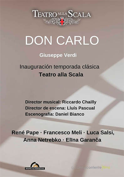 Libreto de François Joseph Méry y Camille du Locle. Basado en el drama de Schiller. Tras recorrer la evolución de los primeros años creativos de Verdi con los estrenos de temporada dedicadas a Juana de Arco, Atila y Macbeth, Riccardo Chailly regresa con una obra maestra, Don Carlo. El soberbio drama político de Schiller compuesto para París y adaptado para la Scala por Verdi ha sido históricamente una cita ineludible para los maestros de la Scala, de Tullio Serafin a Arturo Toscanini, pasando por Claudio Abbado, que lo dirigió dos veces el 7 de diciembre en 1968 y 1977, y Riccardo Muti. Para la nueva producción regresa a la Scala Lluís Pasqual, que desde su experiencia en el Teatre Lliure de Barcelona hasta sus años con Strehler en el Piccolo y el Odeón de París, ha hecho de la reflexión sobre el Barroco una constante en su trabajo.