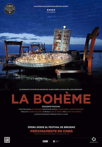 Tres gigantescas mesas de bistró a orillas del lago de Constanza forman el escenario de esta producción de La Bohème. El Festival de Bregenz ha montado la historia atemporal de Puccini sobre los anhelos y los sueños de un grupo de jóvenes artistas en París, en el escenario flotante más grande del mundo. Público y crítica de todo el mundo han aclamado esta producción.