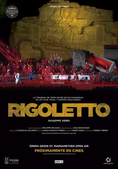 Bajo el cielo estrellado del histórico anfiteatro romano de St. Margarethen, la tragedia de Rigoletto cobró vida en una de las producciones más visualmente impresionantes de la temporada 2017. Esta versión al aire libre, dirigida escénicamente por Philippe Arlaud, ofreció una lectura moderna, poderosa y emocionalmente devastadora del drama verdiano, conjugando arte, tecnología y grandes voces.